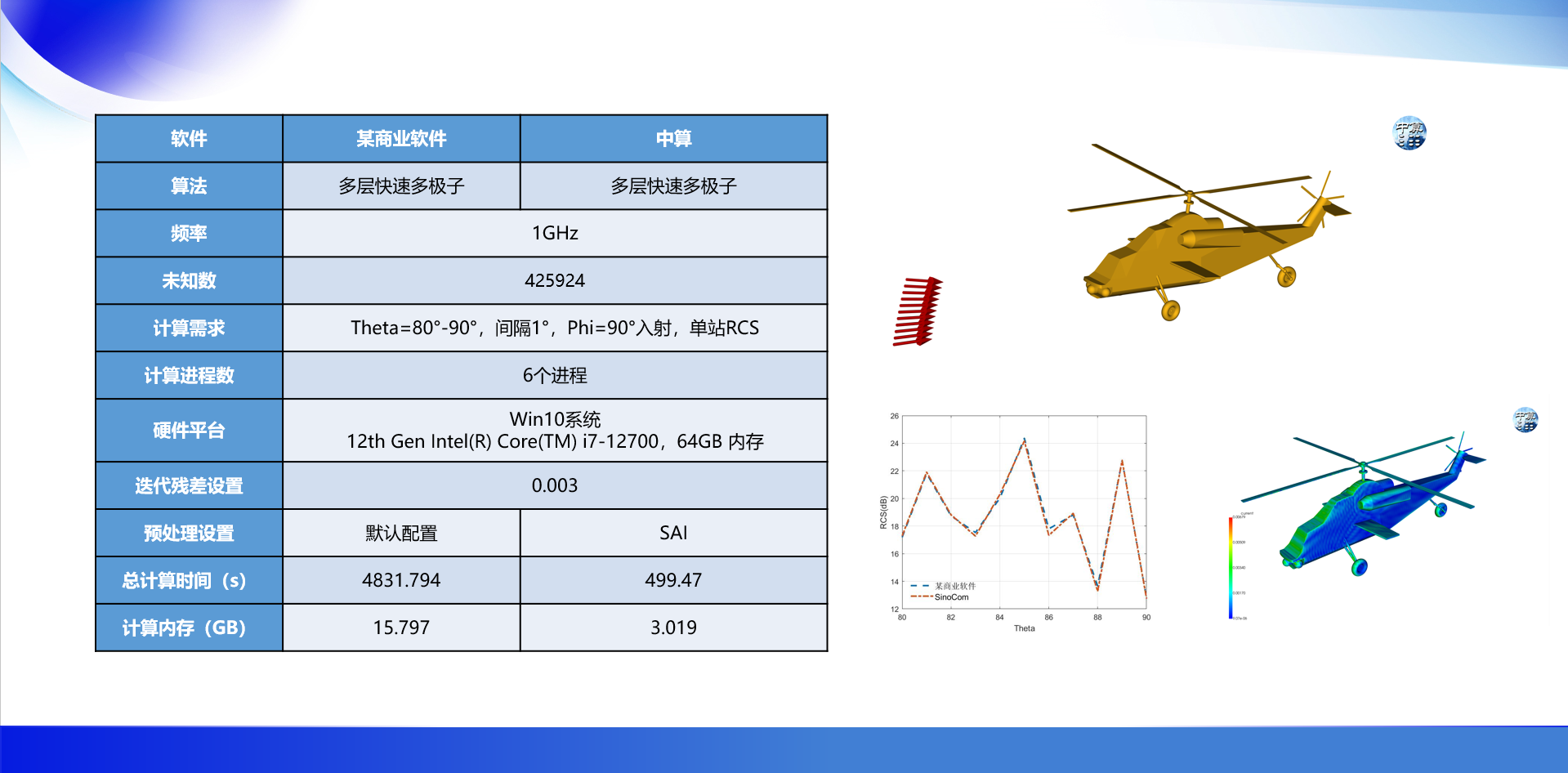 中算电磁仿真软件产品完全自主可控。软件具备完善的、匹配行业需求的前、后处理模块,能够模拟任意复杂形状、含腔体结构、涂覆的复合目标电磁散射,可用于含厚涂敷吸波材料、天线罩-天线阵复合结构、蜂窝吸波结构等效体等的隐身目标电磁散射特性精确分析,实现对关键领域迫切需要的目标、背景和干扰一体化电磁仿真、隐身飞机部件及整机的设计等应用需求。
